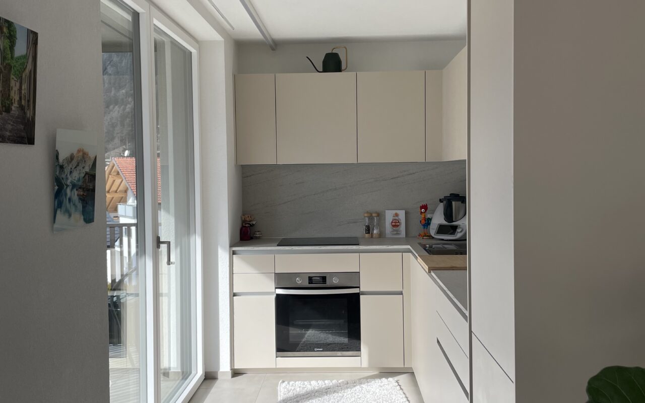 L’appartamento è rifinito con materiali di alta qualità e la cucina è arredata; una cantina e due posti auto completano l’offerta.